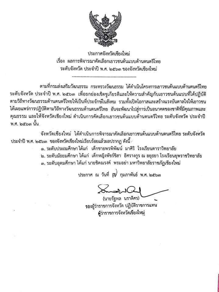 สำหรับการคัดเลือกเยาวชนต้นแบบด้านดนตรีไทยของจังหวัดเชียงใหม่ ผลปรากฏว่า นายชิดณรงค์ พรมหย่า นักศึกษาหลักสูตรครุศาสตรบัณฑิต สาขาดนตรีศึกษา มหาวิทยาลัยราชภัฏเชียงใหม่ ได้รับการคัดเลือกให้เป็นเยาวชนต้นแบบด้านดนตรีไทยของจังหวัดเชียงใหม่ ระดับอุดมศึกษา ซึ่งจะเข้ารับโล่และเกียรติบัตรจากรัฐมนตรีว่าการกระทรวงวัฒนธรรม และผู้ว่าราชการจังหวัดเชียงใหม่ต่อไป