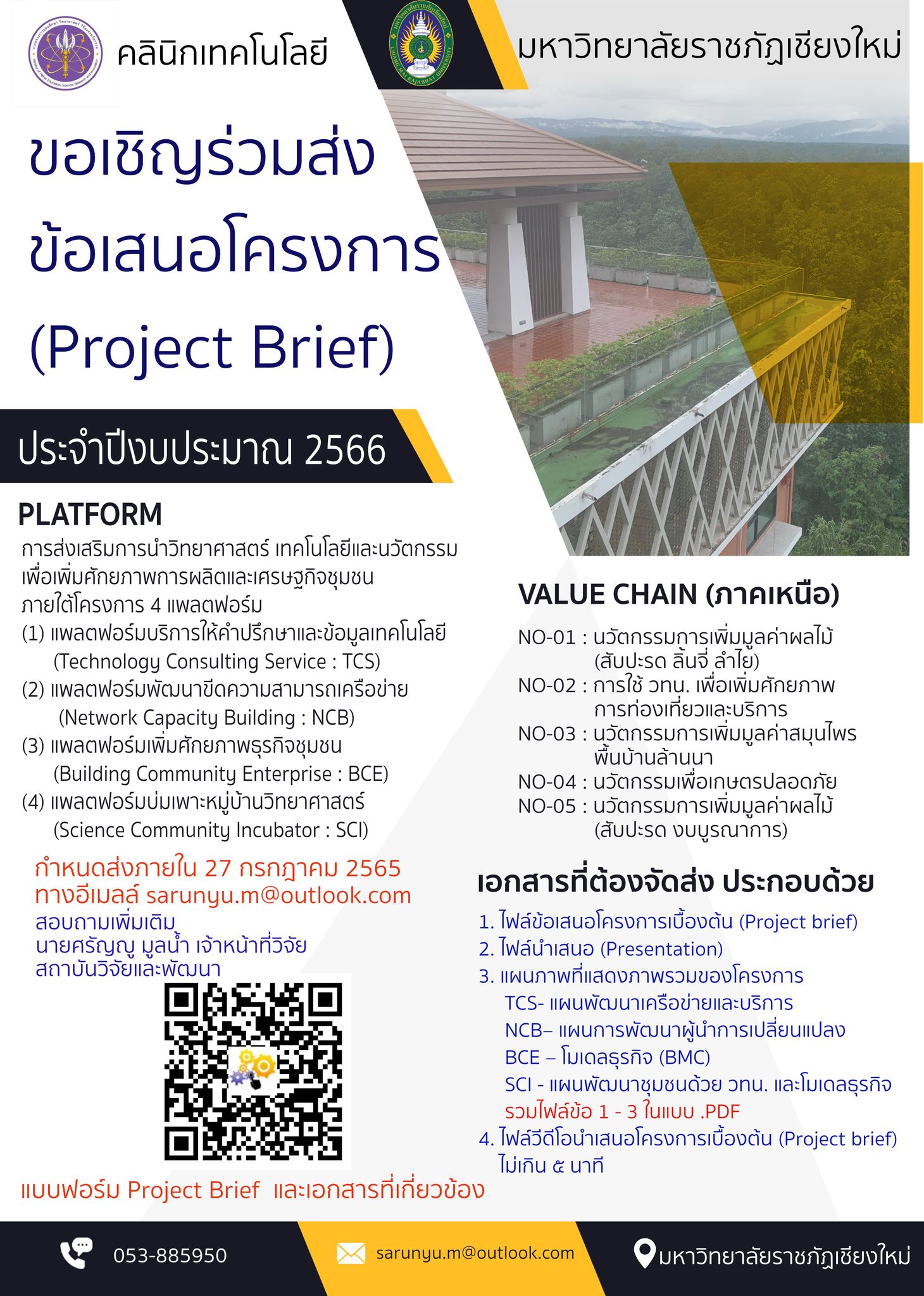 คลินิกเทคโนโลยี มหาวิทยาลัยราชภัฏเชียงใหม่ โดยสถาบันวิจัยและพัฒนา ขอเชิญผู้สนใจร่วมส่งข้อเสนอโครงการเบื้องต้น (Project Brief) ประจำปีงบประมาณ 2566 เพื่อขอทุนภายใต้คลินิกเทคโนโลยี แพลตฟอร์มการส่งเสริมการนำวิทยาศาสตร์