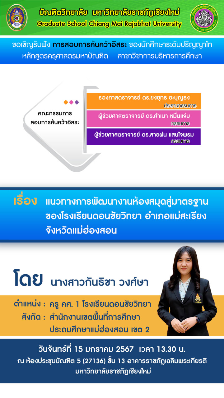 บัณฑิตวิทยาลัย มร.ชม. ขอเชิญรับฟังการสอบการค้นคว้าอิสระ หลักสูตรครุศาสตรมหาบัณฑิต สาขาวิชาการบริหารการศึกษา