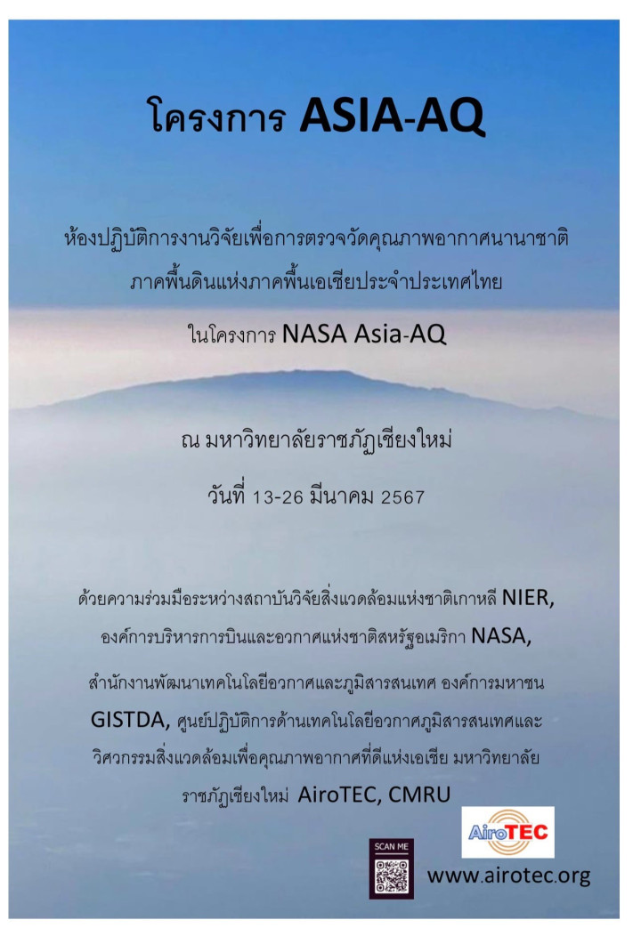 อ.ดร.รัชพล สัมพุทธานนท์ ผู้อำนวยการศูนย์ปฏิบัติการด้านเทคโนโลยีอวกาศภูมิสารสนเทศและวิศวกรรมสิ่งแวดล้อมเพื่อคุณภาพอากาศที่ดีแห่งเอเชีย (AiroTEC) เปิดเผยว่า เนื่องด้วยศูนย์ AiroTEC ร่วมมือกับ สถาบันวิจัยสิ่งแวดล้อมแห่งชาติสาธารณรัฐเกาหลี (NIER) ดำเนินโครงการตรวจวัดคุณภาพอากาศในภาคพื้นเอเชีย NASA ASIA-AQ โดยมหาวิทยาลัยราชภัฏเชียงใหม่กำหนดจัดพิธีเปิดศูนย์ปฏิบัติการนานาชาติตรวจวัดคุณภาพอากาศภาคพื้นเอเชียประเทศไทย (Thailand Ground Measurement Laboratory) ในวันอังคารที่ 12 มีนาคม 2567 เวลา 09.00 – 12.00 น. ณ อาคาร 13 ชั้น 4 มหาวิทยาลัยราชภัฏเชียงใหม่ พื้นที่เวียงบัว