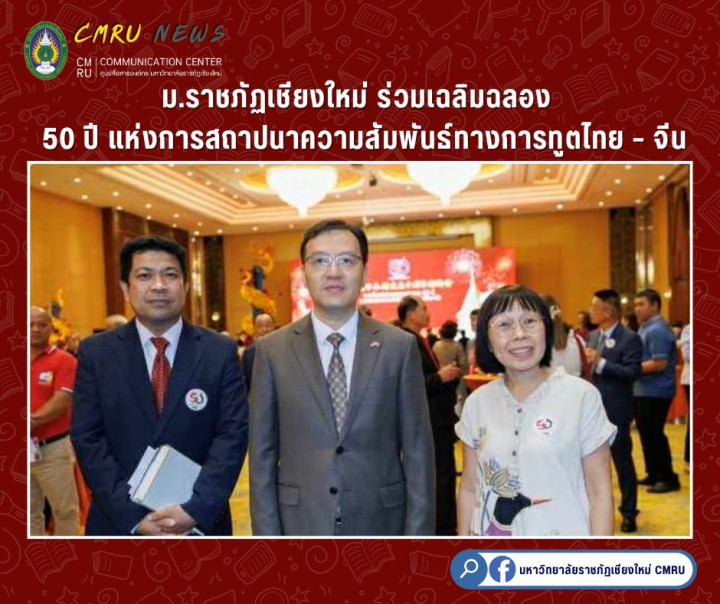 เมื่อวันที่ 1 กรกฎาคม 2568 อาจารย์ ดร.อัครสิทธิ์ บุญส่งแท้ รองอธิการบดีมหาวิทยาลัยราชภัฏเชียงใหม่ พร้อมด้วย อาจารย์ ดร.ประนอม ลำงาม อาจารย์ประจำสาขาวิชาภาษาจีน คณะมนุษยศาสตร์และสังคมศาสตร์ ได้ร่วมงานเฉลิมฉลองเนื่องในโอกาสครบรอบ 50 ปีแห่งการสถาปนาความสัมพันธ์ทางการทูตไทย – สาธารณรัฐประชาชนจีน ณ ห้องแกรนด์ลานนาบอลรูม โรงแรมแชงกรี-ลา เชียงใหม่ จังหวัดเชียงใหม่  งานดังกล่าวจัดขึ้นโดยสถานกงสุลใหญ่แห่งสาธารณรัฐประชาชนจีนประจำเชียงใหม่ เพื่อแสดงถึงมิตรภาพอันแน่นแฟ้นระหว่างสองประเทศ และส่งเสริมความร่วมมือทางด้านการศึกษา วัฒนธรรม เศรษฐกิจ และการทูต