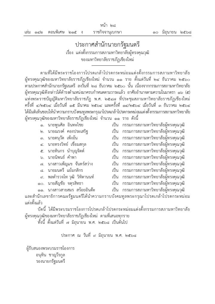 ทั้งนี้ สำนักเลขาธิการคณะรัฐมนตรีได้นำความกราบบังคมทูลพระกรุณาโปรดเกล้าโปรดกระหม่อมแต่งตั้ง และมีพระบรมราชโองการโปรดเกล้าโปรดกระหม่อมแต่งตั้งกรรมการสภามหาวิทยาลัยผู้ทรงคุณวุฒิของมหาวิทยาลัยราชภัฏเชียงใหม่ ตั้งแต่วันที่ 7 มิถุนายน พ.ศ. 2568 รวม 11 ท่าน ดังนี้