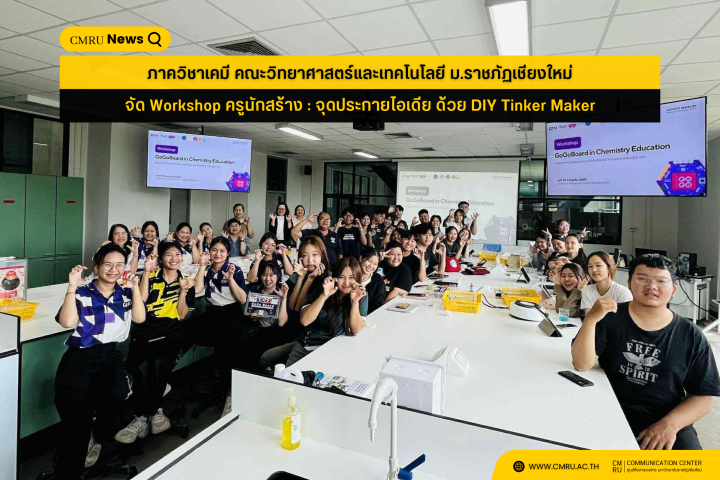 เมื่อวันที่ 19 กรกฎาคม 2568 ภาควิชาเคมี คณะวิทยาศาสตร์และเทคโนโลยี มหาวิทยาลัยราชภัฏเชียงใหม่ จัดการอบรมเชิงปฏิบัติการเรื่อง ครูนักสร้าง : จุดประกายไอเดีย ด้วย DIY Tinker Maker ตามโครงการ “ครูวิทยาศาสตร์และเทคโนโลยีในดวงใจ คิดได้ ทำเป็น เด่นทักษะ” ณ อาคาร SCI6 คณะวิทยาศาสตร์และเทคโนโลยี มหาวิทยาลัยราชภัฏเชียงใหม่ ศูนย์แม่ริม อำเภอแม่ริม จังหวัดเชียงใหม่ เพื่อส่งเสริมให้นักศึกษาหลักสูตรครุศาสตรบัณฑิต สาขาวิชาเคมี มีทักษะด้านการออกแบบกิจกรรมการเรียนรู้ที่สร้างสรรค์ เน้นผู้เรียนเป็นสำคัญด้วยแนวคิด DIY Tinker Maker ที่เน้นกระบวนการคิดเชิงออกแบบ (Design Thinking) และการจัดการเรียนรู้เชิงรุก (Active Learning) ผ่านการปฏิบัติจริง