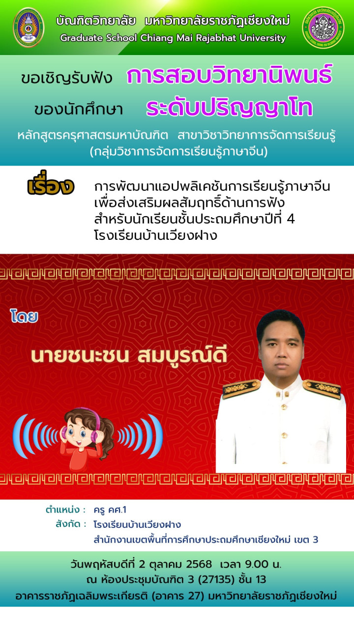วันที่ 2 ตุลาคม 2568 เวลา 09.00 น. ขอเชิญรับฟังการสอบวิทยานิพนธ์ หลักสูตรครุศาสตรมหาบัณฑิต สาขาวิชาวิทยาการจัดการเรียนรู้ (กลุ่มวิชาการจัดการเรียนรู้ภาษาจีน) เรื่อง การพัฒนาแอปพลิเคชัน  การเรียนรู้ภาษาจีนเพื่อส่งเสริมผลสัมฤทธิ์ด้านการฟังสำหรับนักเรียนชั้นประถมศึกษาปีที่ 4 โรงเรียนบ้านเวียงฝาง นำเสนอโดย นายชนะชน สมบูรณ์ดี ครู คศ.1 โรงเรียนบ้านเวียงฝาง สำนักงานเขตพื้นที่การศึกษาประถมศึกษาเชียงใหม่ เขต 3 ผู้สนใจร่วมรับฟังได้ ณ ห้องประชุมบัณฑิต 3 ชั้น 13 อาคารราชภัฏเฉลิมพระเกียรติ มหาวิทยาลัยราชภัฏเชียงใหม่ พื้นที่เวียงบัว