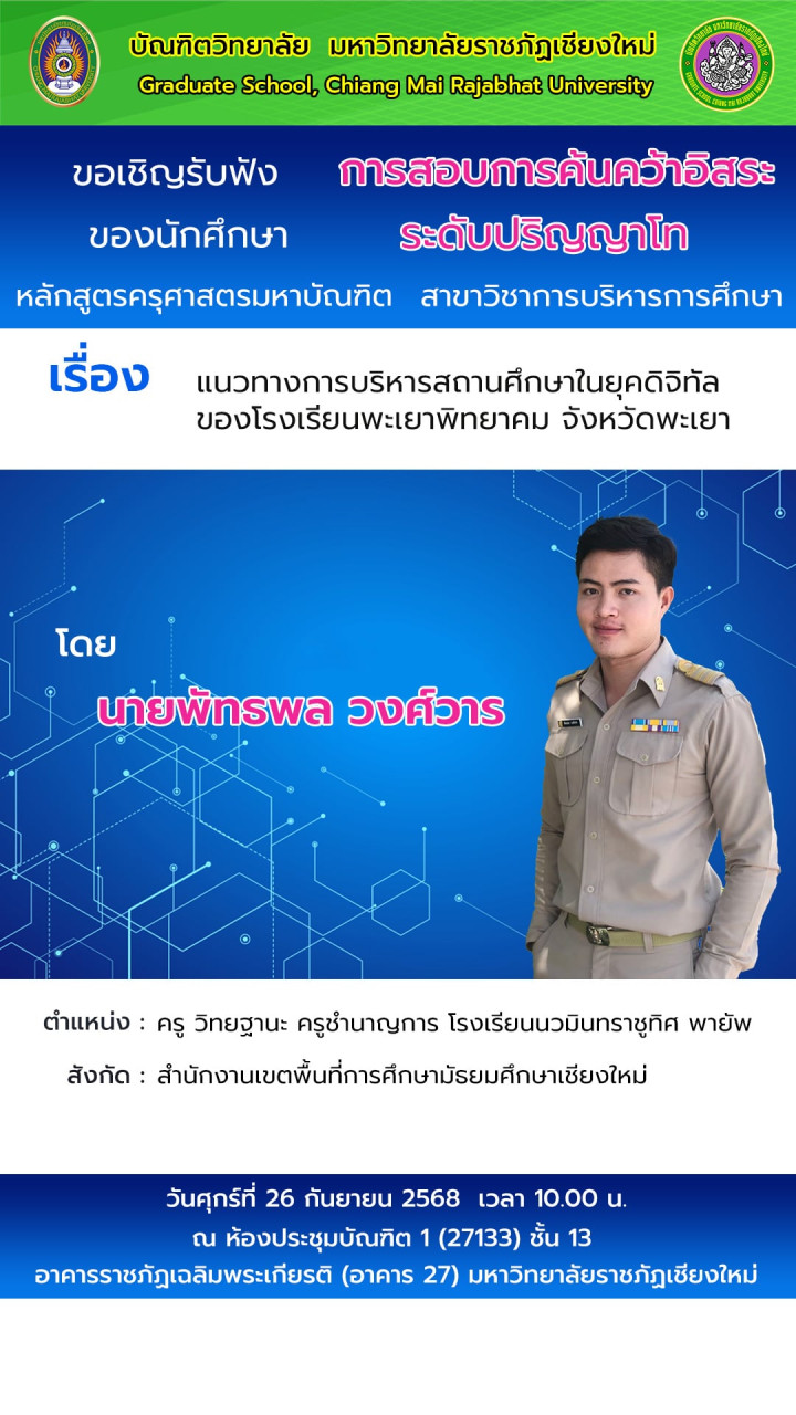 วันที่ 26 กันยายน 2568 เวลา 10.00 น. ขอเชิญรับฟังการสอบการค้นคว้าอิสระของนักศึกษาระดับปริญญาโท หลักสูตรครุศาสตรมหาบัณฑิต สาขาวิชาการบริหารการศึกษา เรื่อง แนวทางการบริหารสถานศึกษาในยุคดิจิทัล ของโรงเรียนพะเยาพิทยาคม จังหวัดพะเยา นำเสนอโดย นายพัทธพล  วงศ์วาร ครูวิทยฐานะ ครูชำนาญการ โรงเรียนนวมินทราชูทิศพายัพ สังกัด สำนักงานเขตพื้นที่การศึกษามัธยมศึกษาเชียงใหม่ ผู้สนใจรับฟังได้ ณ ห้องประชุมบัณฑิต 1 ชั้น 13 อาคารราชภัฏเฉลิมพระเกียรติ มหาวิทยาลัยราชภัฏเชียงใหม่ พื้นที่เวียงบัว