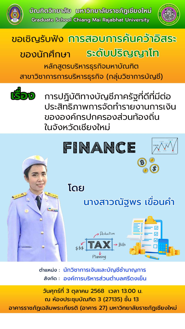และ วันที่ 3 ตุลาคม 2568 เวลา 13.00 น. ขอเชิญรับฟังการสอบการค้นคว้าอิสระ หลักสูตรบริหารธุรกิจมหาบัณฑิต สาขาวิชาการบริหารธุรกิจ (กลุ่มวิชาการบัญชี) เรื่อง การปฏิบัติทางบัญชีภาครัฐที่ดีที่มีต่อปนะสิทธิภาพการจัดทำรายงานการเงินขององค์กรปกครองส่วนท้องถิ่นในจังหวัดเชียงใหม่ นำเสนอโดย นางสาวณัฐพร เขื่อนคำ นักวิชาการการเงินและบัญชีชำนาญการ สังกัด องค์การบริหารส่วนตำบลศรีดงเย็น ผู้สนใจร่วมรับฟังได้ ณ ห้องประชุมบัณฑิต 3 ชั้น 13 อาคารราชภัฏเฉลิมพระเกียรติ มหาวิทยาลัยราชภัฏเชียงใหม่ พื้นที่เวียงบัว จึงขอเชิญชวนผู้สนใจรับฟังตามวันเวลาและสถานที่ดังกล่าว