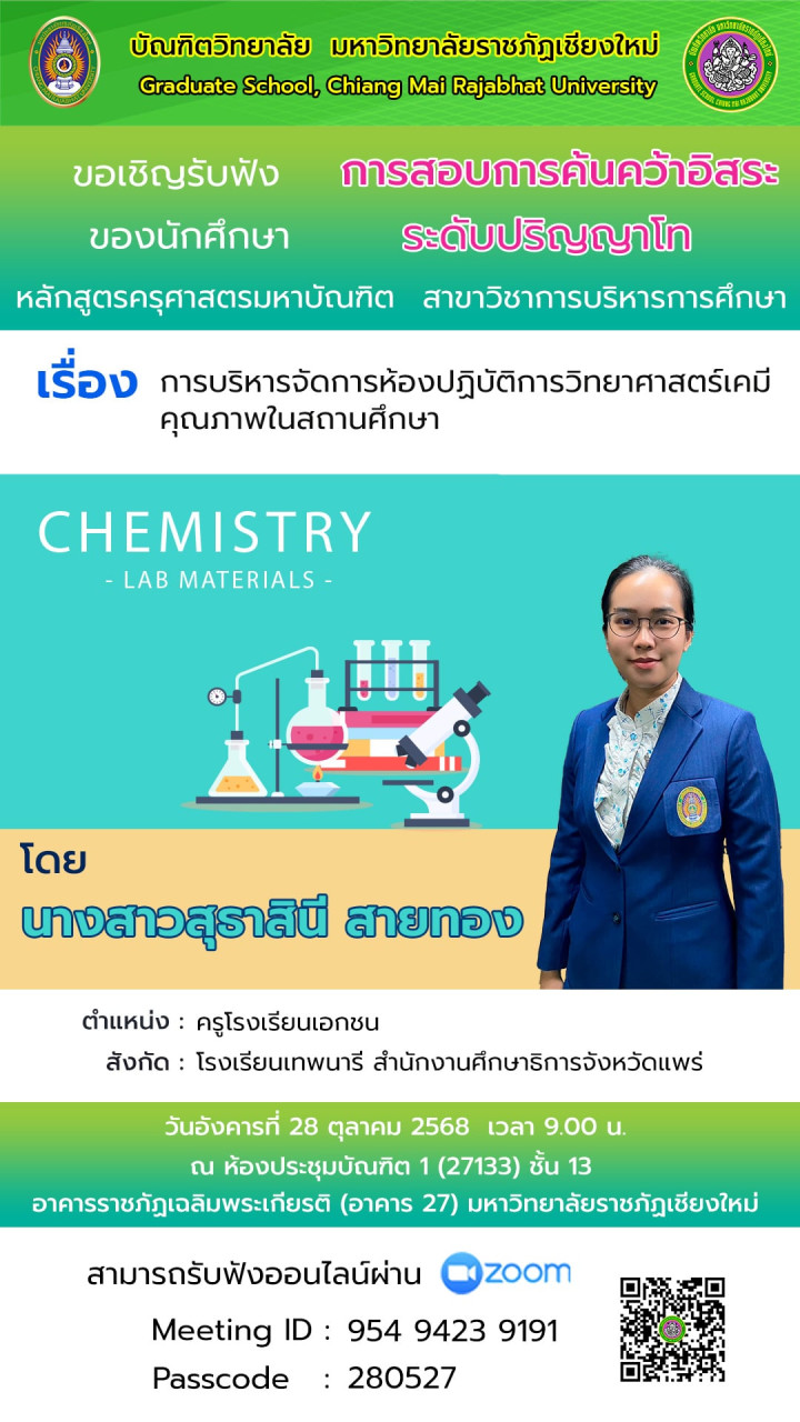 วันอังคารที่ 28 ตุลาคม 2568 เวลา 9.00 น. การสอบการค้นคว้าอิสระ ของนักศึกษา ระดับปริญญาโท หลักสูตรครุศาสตรมหาบัณฑิต สาขาวิชาการบริหารการศึกษา เรื่องการบริหารจัดการห้องปฏิบัติการวิทยาศาสตร์เคมีคุณภาพในสถานศึกษา นำเสนอโดย นางสาวสุธาสินี สายทอง ครูโรงเรียนเอกชน สังกัด : โรงเรียนเทพนารี สำนักงานศึกษาธิการจังหวัดแพร่ ผู้สนใจร่วมรับฟัง ณ ห้องประชุมบัณฑิต 1 (27133) ชั้น 13 อาคารราชภัฏเฉลิมพระเกียรติ (อาคาร 27) มหาวิทยาลัยราชภัฏเชียงใหม่ หรือสามารถรับฟังออนไลน์ผ่าน Zoom Meeting ID : 954 9423 9191 Passcode : 280527