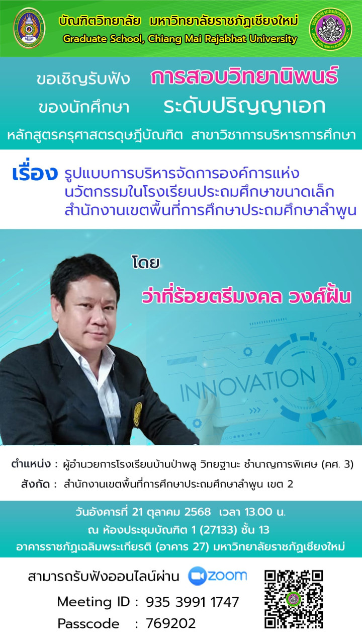 วันอังคารที่ 21 ตุลาคม 2568 เวลา 13.00 น. หลักสูตรครุศาสตรดุษฎีบัณฑิต เรื่องรูปแบบการบริหารจัดการองค์กรแห่งนวัตกรรมในโรงเรียนประถมศึกษาขนาดเล็ก สำนักงานเขตพื้นที่การศึกษาประถมศึกษาลำพูน นำเสนอโดย ว่าที่ร้อยตรีมงคล วงศ์ฝั้น ผู้อำนวยการโรงเรียนบ้านป่าพลู วิทยฐานะ ชำนาญการพิเศษ (คศ. 3)สำนักงานเขตพื้นที่การศึกษาประถมศึกษาลำพูน เขต 2 ผู้สนใจร่วมรับฟัง ณ ห้องประชุมบัณฑิต 1 (27133) ชั้น 13 อาคารราชภัฏเฉลิมพระเกียรติ (อาคาร 27) มหาวิทยาลัยราชภัฏเชียงใหม่ และสามารถรับฟังออนไลน์ผ่าน Zoom Meeting ID : 935 3991 1747 Passcode : 769202