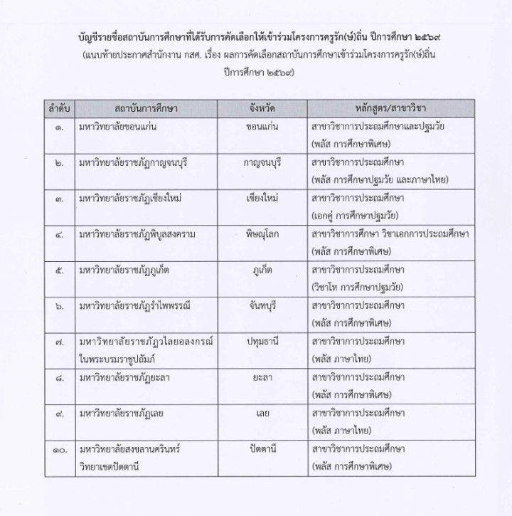 มหาวิทยาลัยราชภัฏเชียงใหม่ ได้รับการคัดเลือกให้เป็นสถาบันผลิตและพัฒนาครูโครงการครูรัก(ษ์)ถิ่น ปีการศึกษา 2569 สาขาวิชาการประถมศึกษา (เอกคู่ การศึกษาปฐมวัย) ตามประกาศสำนักงานกองทุนเพื่อความเสมอภาคทางการศึกษา (กสศ.) เรื่อง ผลการคัดเลือกสถาบันการศึกษาเข้าร่วมโครงการครูรัก(ษ์)ถิ่น ปีการศึกษา 2569 ลงวันที่ 22 ตุลาคม 2568