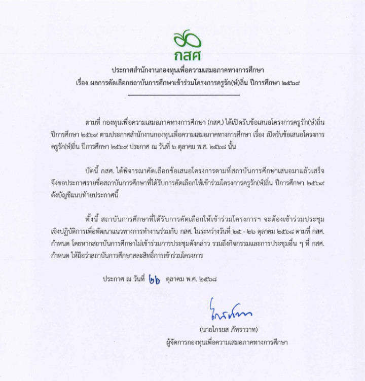 ทั้งนี้นับเป็นก้าวสำคัญของการผลิตและพัฒนาครูรุ่นใหม่ที่มีคุณภาพ มีจิตวิญญาณของครูนักพัฒนา และมีความสามารถในการจัดการเรียนการสอนและการพัฒนาผู้เรียน โดยสร้างโอกาสให้กับนักเรียนที่ขาดแคลนทุนทรัพย์ แต่มีใจรักที่จะเป็นครูเพื่อพัฒนาโรงเรียนและชุมชนในพื้นที่ห่างไกล ซึ่งเป็นชุมชนภูมิลำเนาของตนเอง เพื่อลดความเหลื่อมล้ำทางการศึกษา นอกจากนี้ยังเป็นการช่วยแก้ปัญหาขาดแคลนและโยกย้ายครูในโรงเรียนพื้นที่ห่างไกล