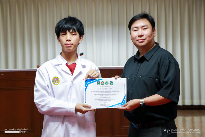 28 พฤศจิกายน 2568 ผู้ช่วยศาสตราจารย์ ดร.กิตติศักดิ์ โชติกเดชาณรงค์ คณบดีบัณฑิตวิทยาลัย มหาวิทยาลัยราชภัฏเชียงใหม่ ให้เกียรติกล่าวโอวาทและมอบเกียรติบัตรการอบรมเชิงปฏิบัติการ เรื่อง การถ่ายทอดเทคโนโลยีการผลิตเครื่องสำอางธรรมชาติเพื่อสร้างจิตสำนึกการอนุรักษ์สมุนไพรไทยแก่นักเรียน รุ่นที่ 5 ภายใต้โครงการตามยุทธศาสตร์มหาวิทยาลัยราชภัฏเพื่อการพัฒนาท้องถิ่น ประจำปีงบประมาณ พ.ศ. 2568 ซึ่งจัดขึ้นโดยบัณฑิตวิทยาลัย มหาวิทยาลัยราชภัฏเชียงใหม่ ร่วมกับศูนย์ความเป็นเลิศด้านกัญชาและเกษตรอินทรีย์นานาชาติ มหาวิทยาลัยราชภัฏเชียงใหม่ (ECOA CMRU) ให้แก่นักเรียน นักศึกษา วิทยาลัยเทคนิคสารภี อำเภอสารภี จังหวัดเชียงใหม่ จำนวน 30 คน