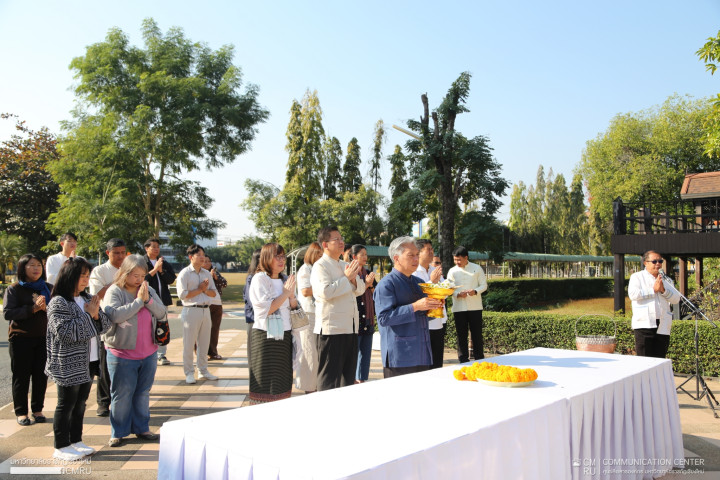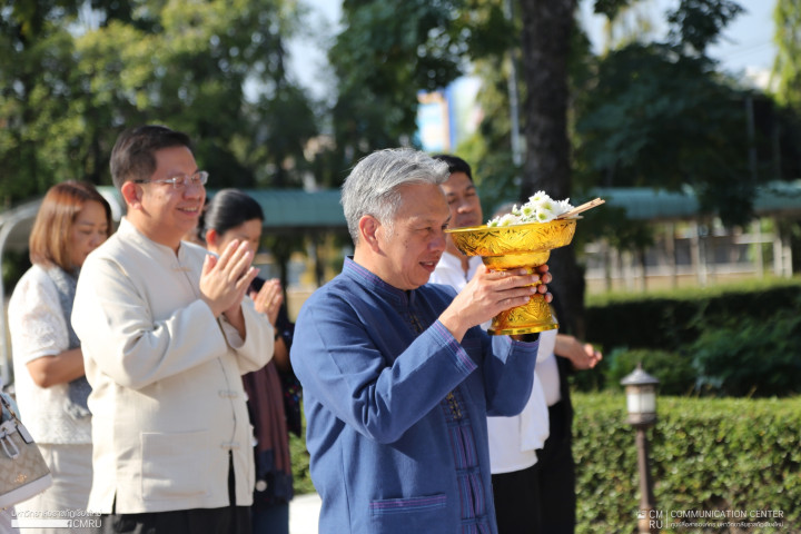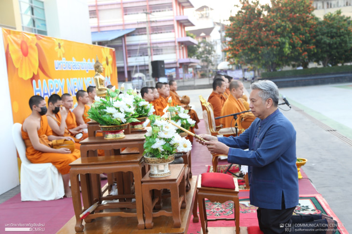 โอกาสนี้ รองศาสตราจารย์ ดร.ชาตรี มณีโกศล อธิการบดีมหาวิทยาลัยราชภัฏเชียงใหม่ นำคณะผู้บริหาร พร้อมด้วยคณาจารย์ บุคลากร และนักศึกษา เข้าร่วมพิธี ในพิธีได้รับเมตตาจาก พระครูธีรสุตพจน์,ดร. เจ้าอาวาสวัดผาลาด (สกทาคามี) เป็นประธานฝ่ายสงฆ์ แสดงสัมโมทนียกถา ให้โอวาทธรรมและอำนวยพรเนื่องในวันขึ้นปีใหม่ จากนั้นได้นำพระสงฆ์สามเณรจากวัดเจดีย์หลวงวรวิหาร จำนวน 39 รูป รับบิณฑบาตข้าวสารอาหารแห้ง