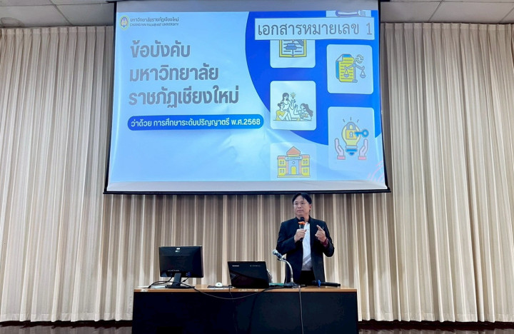 เมื่อวันที่ 7 มกราคม 2569  รศ.ดร.ชาตรี มณีโกศล อธิการบดี มหาวิทยาลัยราชภัฏเชียงใหม่ เป็นประธานเปิดการประชุมสัมมนาอาจารย์ที่ปรึกษา นักศึกษาระดับปริญญาตรี (รหัส65-68) ครั้งที่ 2 ณ ห้องประชุมเอื้องสามปอยหลวง อาคารราชภัฏเฉลิมพระเกียรติ มหาวิทยาลัยราชภัฏเชียงใหม่ พื้นที่เวียงบัว ซึ่งจัดโดยสำนักทะเบียนและประมวลผล เพื่อสร้างความรู้ความเข้าใจเกี่ยวกับบทบาทหน้าที่และแนวทางปฏิบัติของอาจารย์ที่ปรึกษา ให้สอดคล้องกับระเบียบและบริบทปัจจุบันของมหาวิทยาลัย เป็นเวทีแลกเปลี่ยนเรียนรู้เทคนิคการให้คำปรึกษาทั้งด้านวิชาการและการใช้ชีวิตในรั้วมหาวิทยาลัย สร้างเครือข่ายอาจารย์ที่ปรึกษาที่เข้มแข็ง ผลิตบัณฑิตที่มีความพร้อมทั้งด้านความรู้คู่คุณธรรมและมีคุณภาพชีวิตที่ดี ร่วมสร้างภูมิคุ้มกันทางสังคม และทักษะการใช้ชีวิตให้กับนักศึกษา ตามแนวทางข้อบังคับมหาวิทยาลัยราชภัฏเชียงใหม่ ว่าด้วยการศึกษาระดับปริญญาตรี พ.ศ.2568 โดยมีอาจารย์จากคณะมนุษยศาสตร์และสังคมศาสตร์ คณะวิทยาการจัดการ และวิทยาลัยนานาชาติ จำนวน 194 ท่าน ผู้บริหารและบุคลากรจำนวน 29 ท่าน รวมทั้งสิ้น 223 ท่าน ร่วมการประชุม
