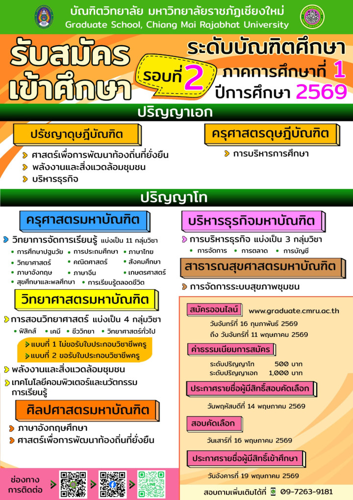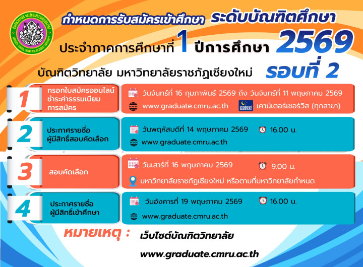 บัณฑิตวิทยาลัย มหาวิทยาลัยราชภัฏเชียงใหม่ เปิดรับสมัครนักศึกษาใหม่ ระดับบัณฑิตศึกษา รอบที่ 2 ปีการศึกษา 2569
