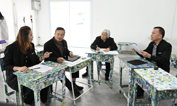 โอกาสนี้ ผู้ช่วยศาสตราจารย์ ดร.เวชสวรรค์ หล้ากาศ จาก มหาวิทยาลัยราชภัฏเชียงใหม่ หัวหน้าโครงการ ให้การต้อนรับและนำเสนอผลการดำเนินงาน พร้อมแลกเปลี่ยนความคิดเห็นกับคณะผู้ทรงคุณวุฒิ โครงการดังกล่าวมีวัตถุประสงค์เพื่อแก้ไขปัญหาความเสียหายของครุภัณฑ์ทางการศึกษาที่ได้รับผลกระทบจากอุทกภัยในพื้นที่ภาคใต้ ซึ่งส่งผลให้โรงเรียนหลายแห่งประสบปัญหาโต๊ะและเก้าอี้โครงเหล็กเกิดสนิมและชำรุด ทีมวิจัยจึงได้พัฒนานวัตกรรมโต๊ะและเก้าอี้นักเรียนจากฝาขวดพลาสติกประเภท PE และ PP ที่มีความแข็งแรง ทนทานต่อสภาพน้ำท่วม และไม่เกิดสนิม ผ่านกระบวนการผลิตที่ไม่ซับซ้อน ได้แก่ การอบ การอัด และการขึ้นรูป นวัตกรรมดังกล่าวออกแบบภายใต้แนวคิดเศรษฐกิจหมุนเวียน (Circular Economy) สามารถนำกลับมารีไซเคิลได้อีกครั้ง คาดว่าจะช่วยลดปริมาณขยะพลาสติกได้ไม่น้อยกว่า 13,200 กิโลกรัม ลดภาระงบประมาณของภาครัฐในการจัดซื้อครุภัณฑ์ทดแทน และส่งเสริมการสร้างรายได้แก่ชุมชนจากการบริหารจัดการขยะอย่างยั่งยืน อันเป็นต้นแบบการพัฒนานวัตกรรมเพื่อสังคมและสิ่งแวดล้อมอย่างเป็นรูปธรรม