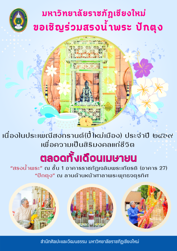 ทั้งนี้ มหาวิทยาลัยราชภัฏเชียงใหม่ ขอเชิญชวนคณะผู้บริหาร คณาจารย์ บุคลากร และนักศึกษา ตลอดจนผู้ที่มาติดต่อราชการทุกท่าน ร่วมสรงน้ำพระพุทธมหาคุณากร พระพุทธรูปประจำมหาวิทยาลัย และปักตุงล้านนา เพื่อความเป็นสิริมงคล เนื่องในโอกาสประเพณีปี๋ใหม่เมือง ประจำปี 2569 ตั้งแต่บัดนี้ถึงวันที่ 30 เมษายน 2569