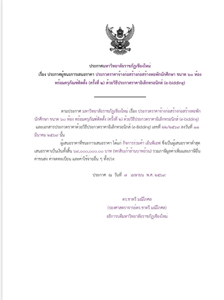 ประกาศผู้ชนะการเสนอราคา ประกวดราคาจ้างก่อสร้างก่อสร้างหอพักนักศึกษา ขนาด 60 ห้อง พร้อมครุภัณฑ์ติดตั้ง (ครั้งที่ 2) ด้วยวิธีประกวดราคาอิเล็กทรอนิกส์ (e-bidding)
