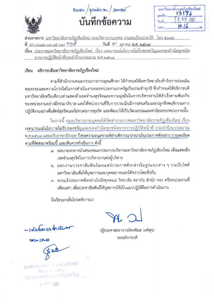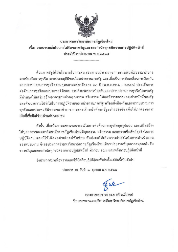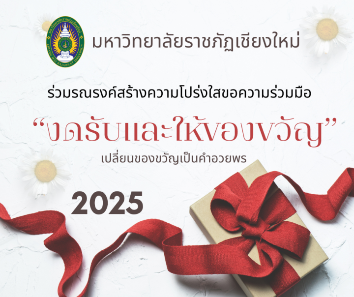 ในปีงบประมาณ พ.ศ. 2568 มหาวิทยาลัยราชภัฏเชียงใหม่ โดยรองศาสตราจารย์ ดร.ชาตรี มณีโกศลรักษาราชการแทนอธิการบดีมหาวิทยาลัยราชภัฏเชียงใหม่ขอเชิญชวนทุกท่านร่วมรณรงค์สร้างความโปร่งใส “เปลี่ยนของขวัญเป็นคำอวยพร”และให้ความร่วมมือในการ “งดรับ งดให้ ของขวัญในทุกเทศกาล” พร้อมกับเชิญชวนส่งความปรารถนาดีผ่านบัตรอวยพร หรือคำอวยพรผ่านสื่อออนไลน์ เพื่อเสริมสร้างมาตรฐานด้านคุณธรรม จริยธรรม ให้แก่ข้าราชการและเจ้าหน้าที่ของรัฐและพัฒนาความโปร่งใสในการปฏิบัติงานของหน่วยงานภาครัฐพร้อมทั้งป้องกันและปราบปรามการทุจริตและประพฤติมิชอบของข้าราชการและเจ้าหน้าที่ของรัฐอย่างจริงจังเพื่อให้ภาคราชการ เป็นที่เชื่อถือไว้วางใจแก่ประชาชน